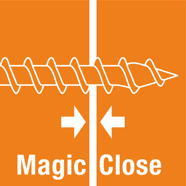Zwei Holzbauteile spaltfrei verschrauben? Das patentierte Vollgewinde MagicClose macht es möglich und erspart zusätzliche Arbeit durch Vorspannen oder den Gebrauch von Teilgewindeschrauben.